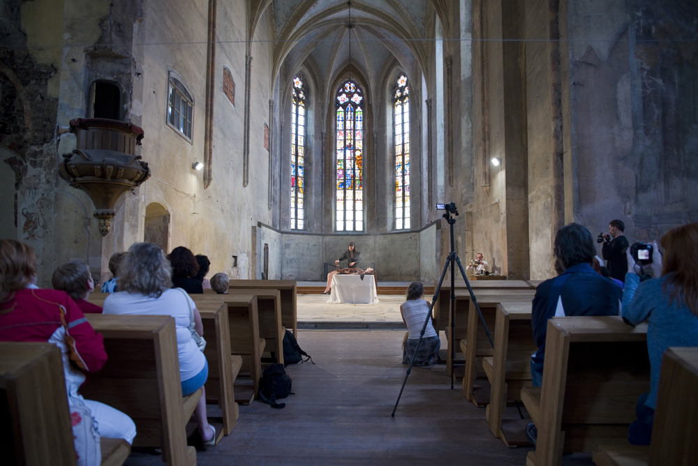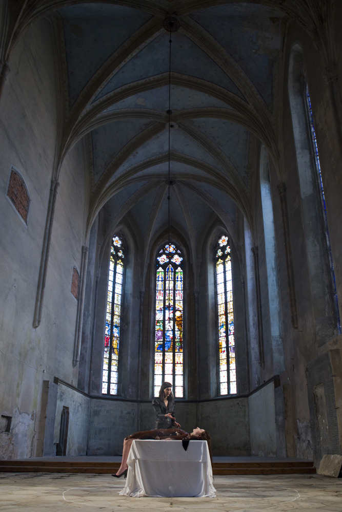 Performance Live altar: Dark matter is my collaboration with performer and poet Jana Orlova.This event happenned 12.6.2015 in deconsecrated church in Cheb.