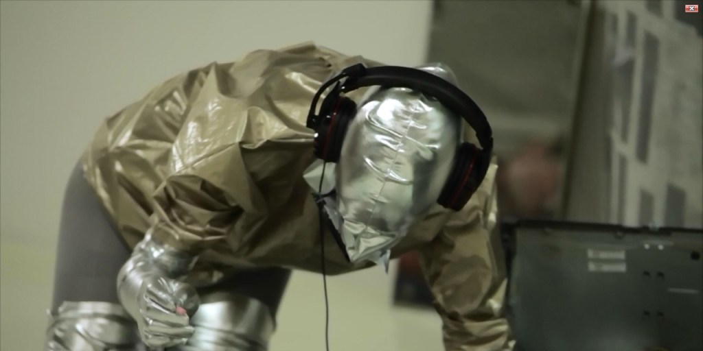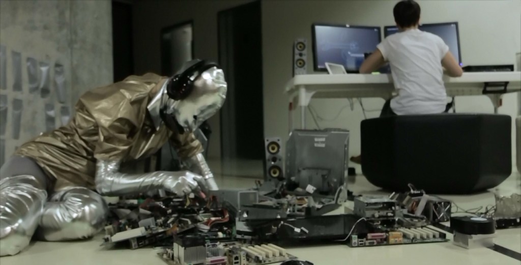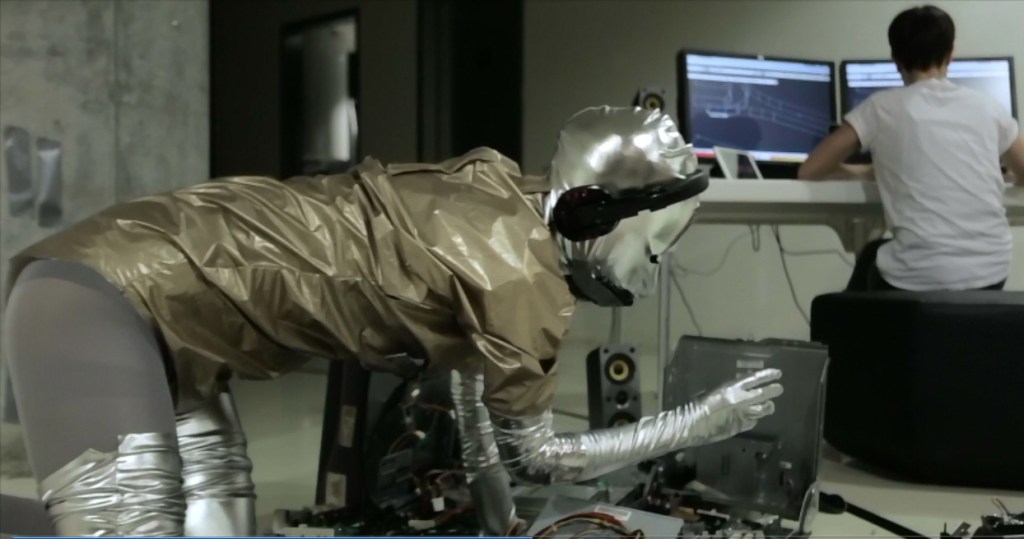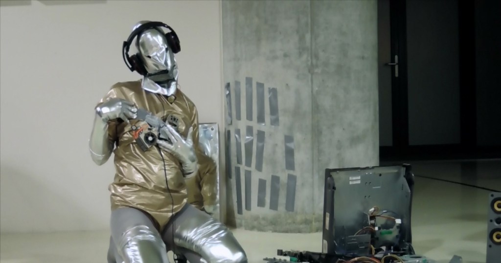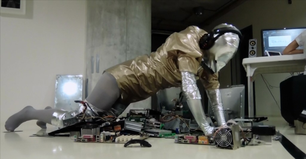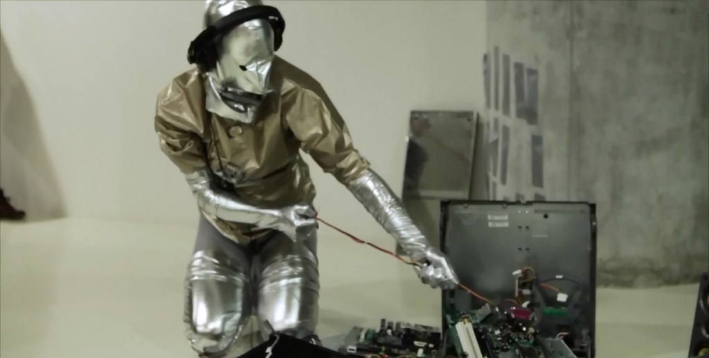 Performance Posthuman Research is realised in collaboration with Johana Střížková. Two voices have fake dialogue with google translate, which is dubbed in the mound of scrap iron.Postapocalyptic scene without any emotions.Human-object in time loop is asking abouth its identity. NTK gallery Prague.