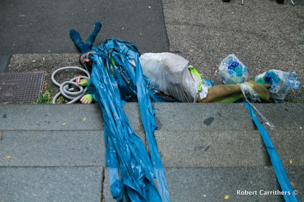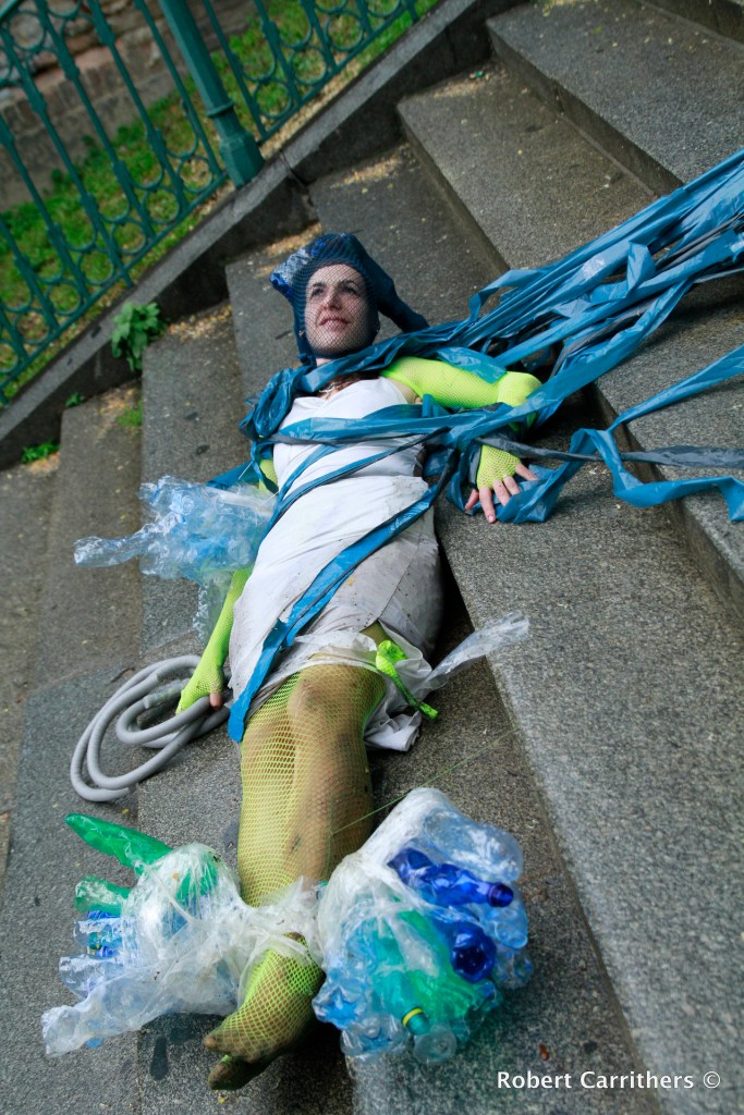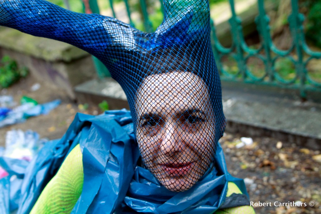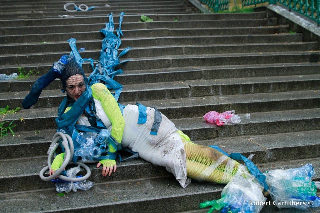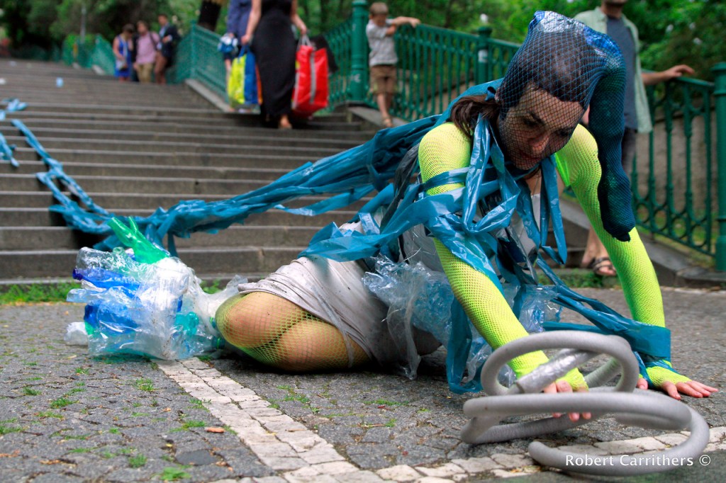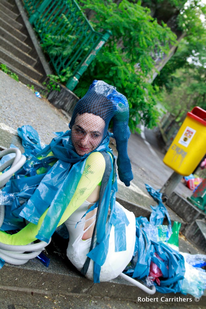 Sirens are totally fascinated by people and their world, dozens of them roam the coast every year, and carry everything they throw away in their homes. At the bottom of the ocean there are strange camps copying the human world. Among other things, he builds them from black boxes of crashed aircraft, cans from coca-cola, old boots, barbed wire or neoprene pieces for windsurfing. (Dorota Maslowska) We build the state of the modern deregulated siren as an allegory of the environment that we build around each other. Stairlifting will be ritualized sailing in the imaginary consumer ocean. Costume made in collaboration with Vaclava Davidová.