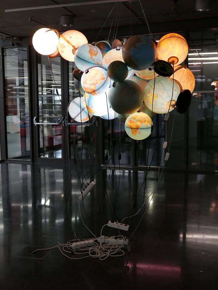The installation Earth Versions is a cluster of different size globes, which are interconnected. The connection method creates a shape of natural wine or grape cluster. Grapes refers to the abundance of fruit, harvest or creative power. A ball or sphere refers in to the female element. The Goddess Gaia is often displayed with globe instead of a pregnant belly and breasts full of milk. Physicality of planet. The Earth versions project illustrates the fact that our planet is a living organism. We, the humans, also cocreates the shared consciousness. We are witnessing, co-creators and destroyers at the same time. Intelligent mass of planets. Grapes from globes refers in to kabbalistic tree of life and also in to knowledge of modern quantum physics. Science and mysticism offer the possibility of that our world exists in many different versions which are pervious. Some of these worlds are known to us, but many of them are hiden. Rationality is irrational.