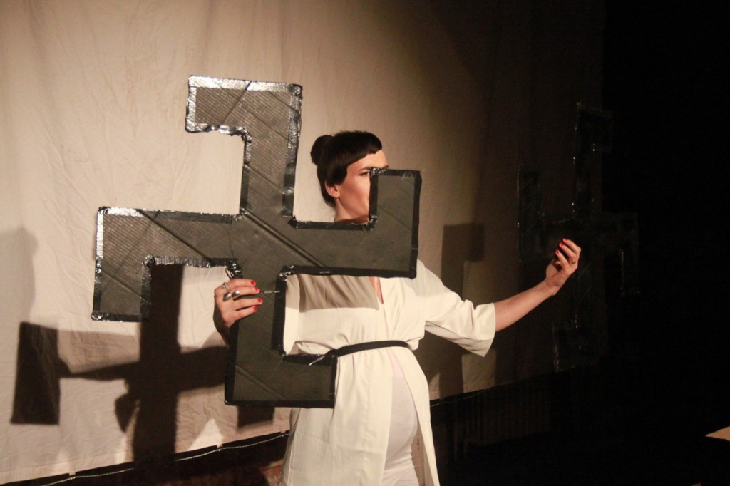 Reclaiming Svastika as archaical symbol of Sun. Deconstruction of Nazi interpretation. Performance held as a part of discussion about growing Rasism and Neonacism in the society. Knihex festival 19.6.2016
